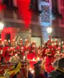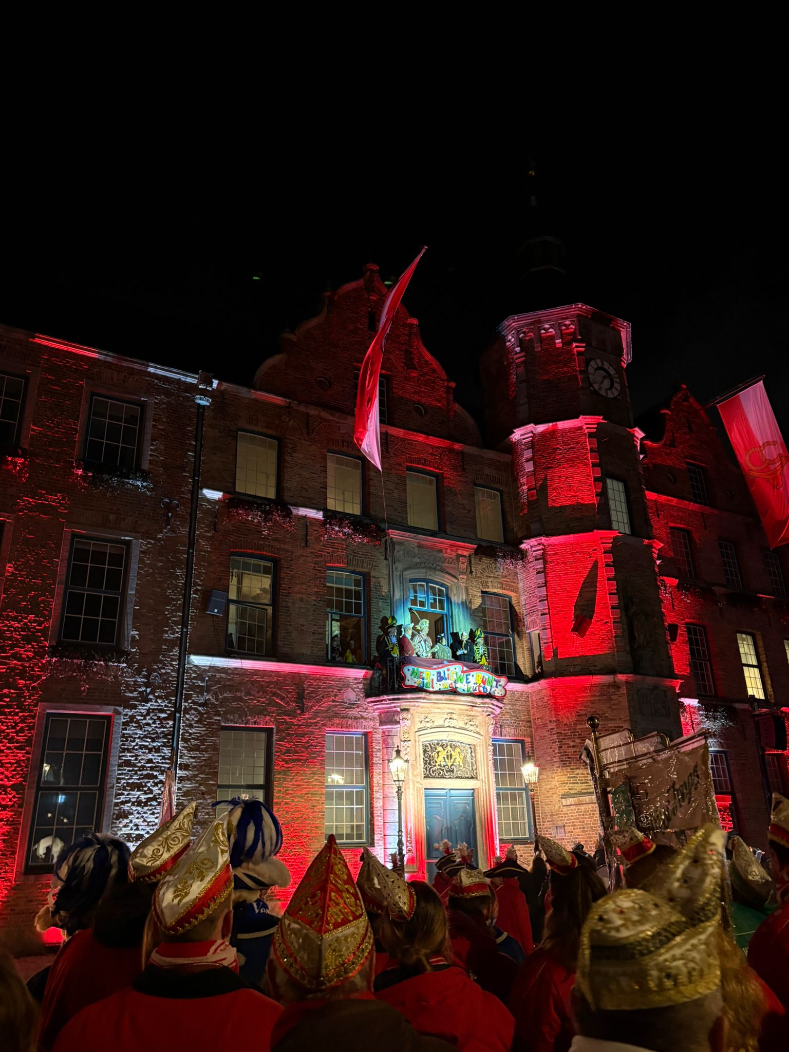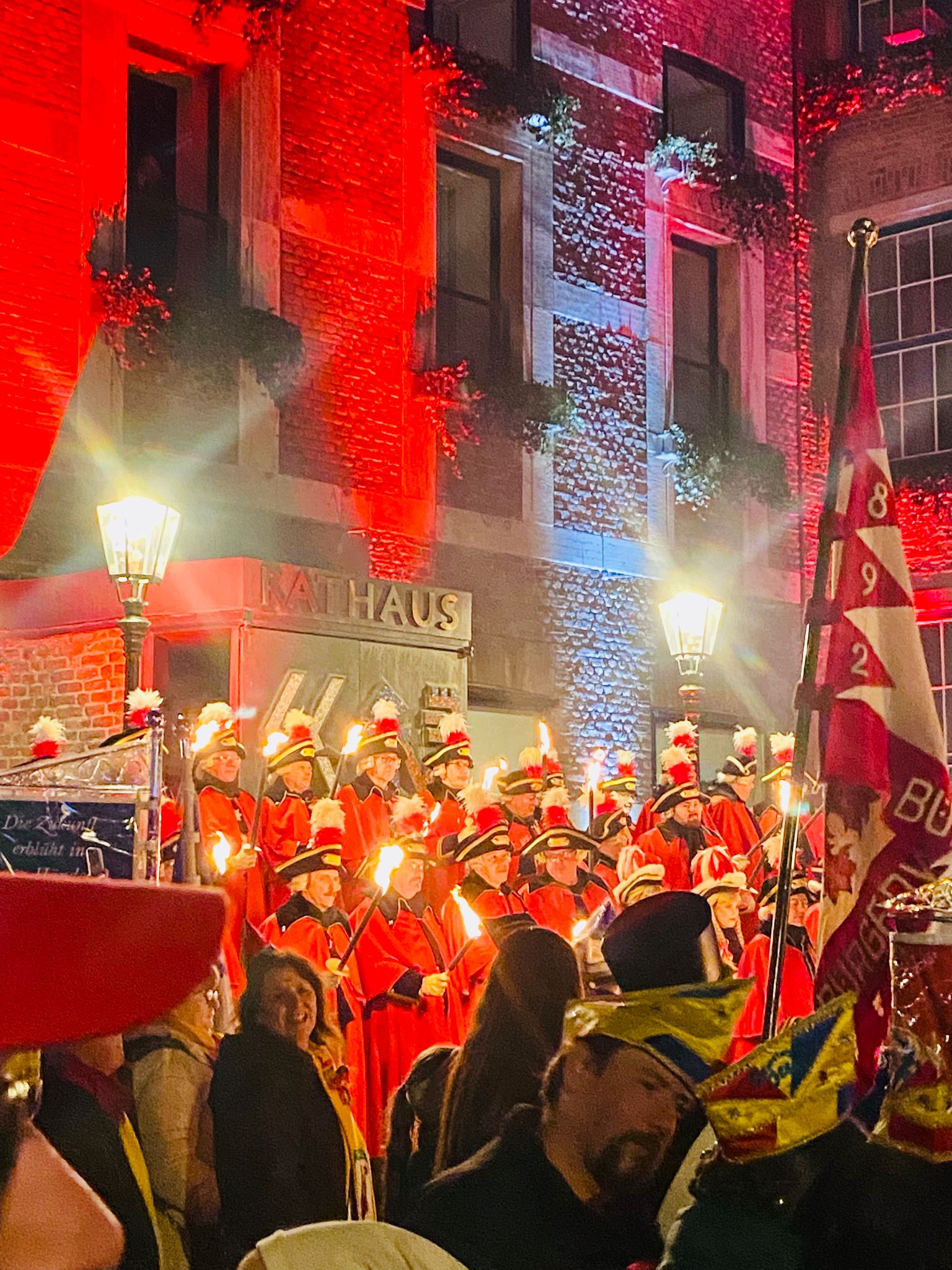 Als die Vereine den Marktplatz erreichten, bot sich ein beeindruckendes Bild: Fackeln erleuchteten den Platz, während das Rathaus in ein tiefes rotes Licht getaucht war. Vor dieser stimmungsvollen Kulisse versammelten sich Garden, Musikzüge und Karnevalisten, während immer wieder ein kräftiges „Düsseldorf Helau!“ über den Platz hallte.